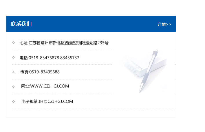 地址:常州市新北區友邦商務大廈1幢16、17層  電話:0519-85101652  傳真:0519-85112595  郵編:213022  網址:www.cz-jiayue_cn.jjbcgj.com  郵箱:xiajifengaa@163.com